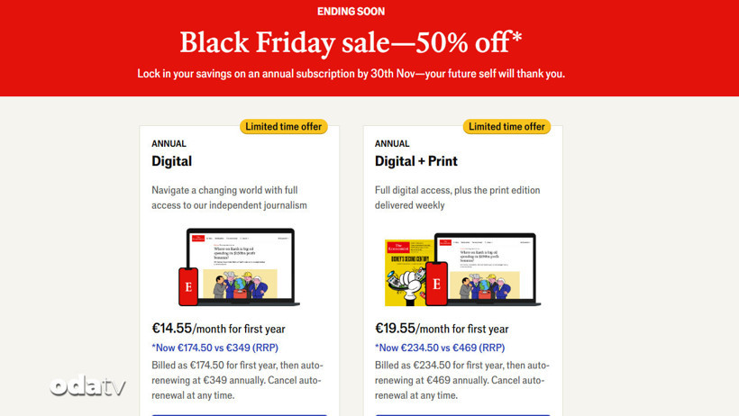 Dünyaca ünlü The Economist de yıllık aboneliğinde yüzde 50 indirim uyguladı. Dergi, yazılı ve dijital içeriklerini kapsayan paketini 469 Euro’dan 235 Euro’ya düşürdü.