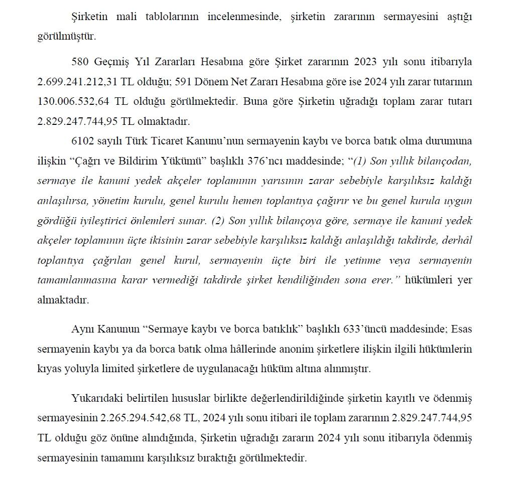 “Şirketin kayıtlı ve ödenmiş sermayesinin 2.265.294.542,68 TL, 2024 yılı sonu itibari ile toplam zararının 2.829.247.744,95 TL olduğu göz önüne alındığında, Şirketin uğradığı zararın 2024 yılı sonu itibarıyla ödenmiş sermayesinin tamamını karşılıksız bıraktığı görülmektedir. … Yönetim Kurulu’nun ve Genel Kurul’un bu konu hakkında herhangi bir girişimde bulunmadığı ve Türk Ticaret Kanunu’nun 376’ncı maddesi gereğince bu durumu ortadan kaldırmaya yönelik tedbirlerin alınmadığı görülmüştür. Bu itibarla Kanun hükmü gereğince Şirket Genel Kurulu tarafından bu yönde herhangi bir karar alınmadığı takdirde şirketin kendiliğinden sona ermesi Kanun’un amir hükmüdür.”